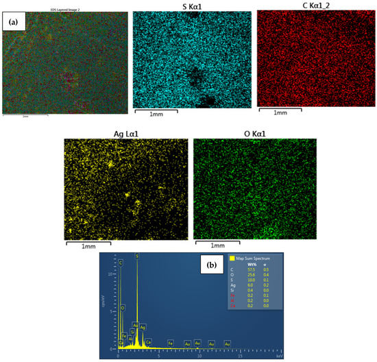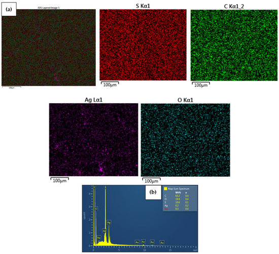 Elemental maps showing the composition of the analyzed AEM membrane surface; (a) combined elemental mapping of C, S, O and Ag and (b) EDS spectra confirming the presence of AgNPs of AEM-Ag3 nanocomposite membrane.