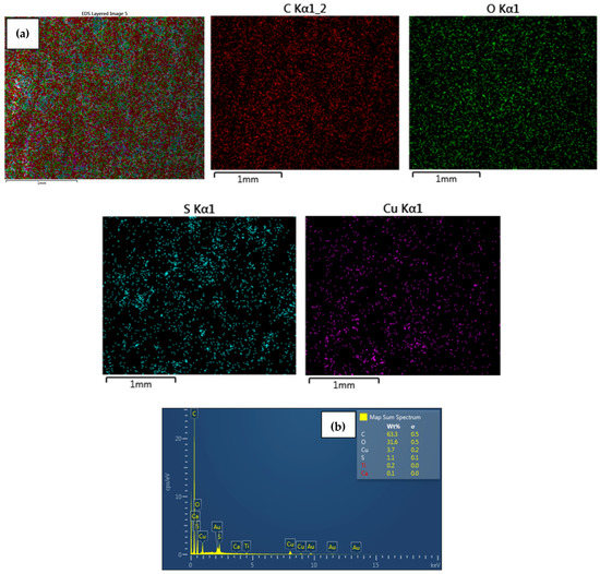 Elemental maps showing the composition of the analyzed CEM membrane surface; (a) combined elemental mapping of C, S, O and Cu and (b) EDS spectra confirming the presence of AgNPs of CuNPs of CEM-Cu3 nanocomposite membrane.