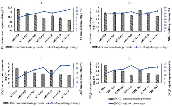 The AEM-3.5 percentage rejection of Cl−, NO3−, SO42−, and PO43− was 8.10%, 61.90%, 18.17%, and 12.06%, respectively, Like the modified CEM, the presence of Ag and Cu NPs on the AEM surface improved the anion percentage rejections. The percentage rejection of AEM-Ag3 was 11.85%, 66.67%, 41.79%, and 22.68% for Cl−, NO3−, SO42−, and PO43−, respectively. For AEM-Cu3, the Cl−, NO3−, SO42−, and PO43− percentage rejections were 12.88%, 69.04%, 45.99%, and 20.62%, respectively. The feed concentrations of Cl−, NO3−, SO42−, and PO43− were found to decrease after the synthetic surface water passed through the AEM-3.5 and functionalized Ag and Cu AEMs; the concentration of the anions in the permeate is shown in Figure 8. On the basis of the obtained percentage rejection results, the order of percentage rejection by the AEM-3.5 and functionalized Ag and Cu AEMs was NO3− > SO42− > PO43− > Cl−. This selectivity is associated with Amberlite IRA 900 resins being nitrate-selective [66]. The increase in metal content increased the anionic percentage rejection. Like the functionalized Ag and Cu CEM-3.5, increasing MNPs resulted in the membrane pore-filling phenomenon and increased the rejection rate [59,63]. The membrane performance results of the functionalized Ag and Cu UF heterogeneous IEMs indicated that the decline in water permeability value improved the salt rejection percentage. Therefore, to enhance ionic selectivity, a compromise between water flux and ion selectivity must be optimized to suit the application [65]. The obtained results of the membranes performances indicated that the functionalized Ag and Cu custom-made UF heterogeneous IEMs reduced the salt content after filtration at a low pressure of 0.5 bars; hence, they can be used for desalination.