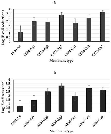 Log reduction in E. coli bacterial count after permeation through the modified Ag and Cu (a) CEM nanocomposite and (b) AEM nanocomposite with different Ag and Cu contents in the membranes. Initial bacterial concentration: 1.82 × 109 CFU/mL (log 9.26 ± 0.62). Error bars represent the standard deviation.