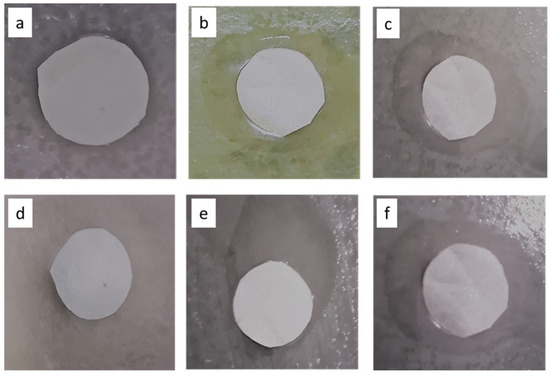 Inhibition zones of (a) CEM-3.5, (b) CEM-Ag3, (c) CEM-Cu3, (d) AEM-3.5, (e) AEM-Ag3, and (f) AEM-Cu3 membranes.