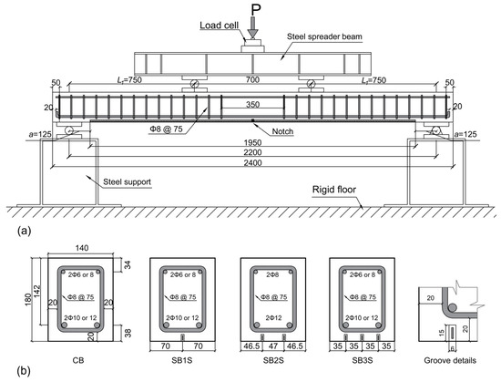 The beams were tested under a four-point bending configuration (see Figure 1). They had a total length of 2400 mm and a clear span length equal to 2200 mm, with a cross-section of 180 mm × 140 mm. The loading span and shear span were 700 mm and 750 mm, respectively. In Groups 1, 2, and 4, two ribbed steel bars with a diameter of 12 mm were used in the tension side of the beams and two ribbed steel bars with a diameter of 8 mm were used in the compression side of the beams. In Group 3, two ribbed steel bars with a diameter of 10 mm and two ribbed steel bars with a diameter of 6 mm were used in the tension and in the compression side of the beams, respectively. To avoid shear failure, a shear reinforcement with a diameter of 8 mm and distance equal to 75 mm was used in all beams. For strengthened beams, CFRP strips with a cross-section of 1.4 mm × 10 mm and bonded length of 1950 mm were used. To allocate the CFRP strips, grooves with dimensions of 6 mm × 15 mm were cut in the soffit of the beam. The dimensions of the grooves and distance between them were set based on fib Bulletin 90 [10] recommendations. To initiate a crack at specific position, all beams had a 5 mm wide and 15 mm deep notch at midspan. The flexural test was performed under displacement control at a rate of 0.6 mm/min.