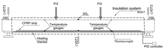 Prior to testing, the beams were heated up to the target temperature using heating blankets that were attached to the soffit of the beam. A proportional integral derivative (PID) controller was utilized for the heating process, and Type-T thermocouples, located between the heating blanket and the soffit of the beam, were used as temperature controller sensors. An isolation system (rock wool with aluminum foil) was used to speed the heating process and to ensure a better heat distribution. To record and monitor the temperature variation during the heating process and flexural testing, different temperature gauges were glued on the concrete surface at the top and bottom of the beam, on the surface of the CFRP, and on the surface of the epoxy adhesive (see Figure 2).
