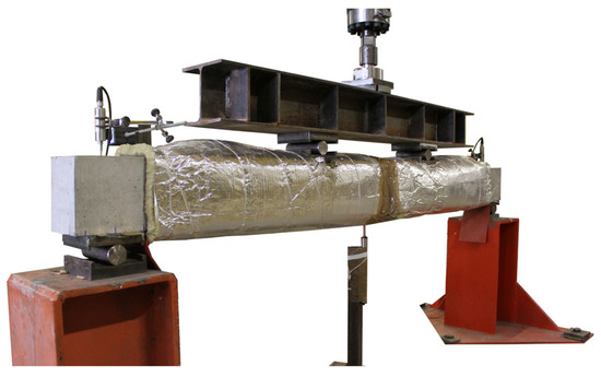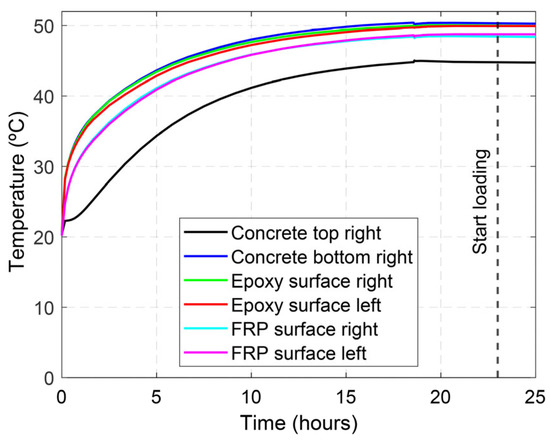 It should be mentioned that the temperature gauges glued on the surface of the CFRP strip were installed prior to introducing the CFRP strip into the groove, and a thin protection layer was applied to protect them from the wet environment during the curing of the epoxy adhesive. Moreover, temperature gauges glued on the surface of the epoxy adhesive were installed once the epoxy was cured, at the outer part of the section. The tests started when the average temperature in the soffit of the beam was stabilized, almost 24 h after the heating process started, and it was kept constant during the loading (see Figure 3). A general view of the test setup is shown in Figure 4.