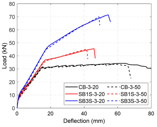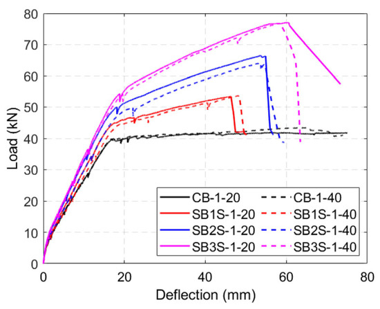 According to Figure 5 that refers to specimens in Group 1, the increase in the testing temperature from 20 °C to 40 °C did not significantly affect the load–deflection curves of the specimens, except for a very slight reduction on specimen’s stiffness.