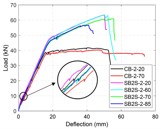 Figure 6 shows the effects of relatively high temperatures in the load–deflection curves of beams belonging to Group 2. In this group, the steel reinforcement ratio and CFRP ratio were kept constant, while the temperature was increased up to near or beyond the Tg of the epoxy (i.e., 60, 70, and 85 °C). Similar to the results obtained for Group 1, increasing the testing temperature up to 60 °C did not significantly affect the ultimate load (i.e., capacity) of the strengthened beams. On the contrary, strengthened specimens tested at temperatures equal to 70 °C and 85 °C showed some reduction in their ultimate load equal to 4.0% and 10.5%, respectively, compared to the corresponding value of the strengthened beam tested at 20 °C (beam SB2S-2-20). Moreover, due to effect of temperature in the mechanical properties of the concrete, ultimate load in the control beam was also reduced (by 3.5%) when the specimen was subjected to 70 °C.