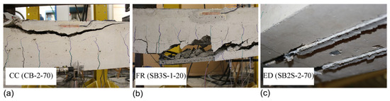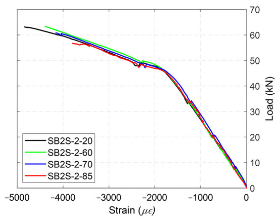The failure mode in all the control (unstrengthened) beams was concrete crushing after yielding of the steel reinforcement (CC), irrespective of the testing temperature. Strengthened specimens belonging to Groups 1, 3, and 4 experienced FRP rupture (FR), and the failure mode did not change with the increase in the testing temperature. Similar behaviors were observed by other authors [18,19,33] and may be attributed to the fact that the temperature applied to those beams was far below the Tg of the epoxy adhesive (experimentally determined to be in the range of 53.9 °C < Tg < 65.3 °C) and the epoxy may have post-cured [8,33,34]. Finally, different failure modes were observed in strengthened specimens belonging to Group 2, depending on the temperature. Specimens tested under 20 °C and 60 °C failed by FRP rupture (FR). With an increase in the temperature to 70 °C, and due to a reduction in the bond resistance between the epoxy and concrete, the beam failed by end debonding (ED) before reaching the ultimate capacity of the strengthening system. A small disturbance in the load–deflection curve at a load level around 60 kN, close to the failure load, might indicate the initiation of the debonding (see Figure 6). Finally, in the specimen tested at 85 °C (specimen SB2S-2-85), a reduction of the stiffness of the specimen was observed around 56 kN, and the load–deflection curve started to flatten, approaching a plateau, which may be due to the achievement of the capacity of the “heated” bonded joint. Although the bonded joint was damaged, the beam eventually failed by concrete crushing (CC). It should be mentioned that at that level of load (56 kN), typical values for the ultimate strain under compression for concrete (around 3.5 and 4%) were registered, as shown in Figure 9 (strains measured with strain gauge SGc in Figure 2).