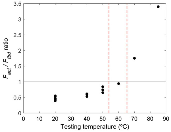The evolution of the Fact/Ffbd ratio with respect to testing temperature is shown in Figure 11. According to this plot, this ratio tended to remain constant for testing temperatures below the Tg of the epoxy adhesive. Once testing temperature approached the lower limit of the range of values for the Tg, the ratio started to increase to a value near to 1 for testing temperatures close to the mid position of the range of values of Tg (i.e., at 60 °C, the ratio Fact/Ffbd equals 0.94). Finally, when the testing temperature overtook the upper limit of the range of values for Tg, the Fact/Ffbd ratio rapidly increased. This demonstrates the effect of high service temperatures on the bond capacity of the adhesive joint, which, in the end, affects the failure mode of NSM CFRP-strengthened RC beams.