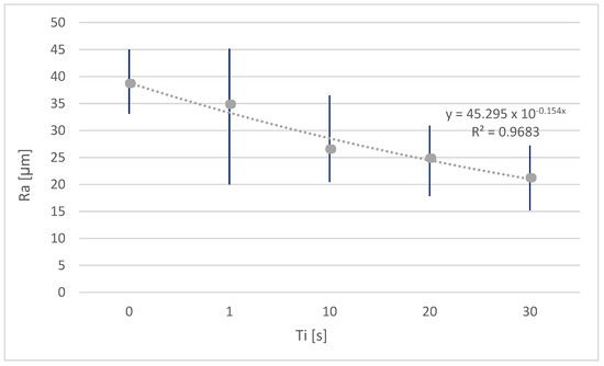 Chemical treatments have been optimized in previous works for the improvement of surface quality [13]. In this work, different immersion times [Ti] in a single solvent (chloroform) have been evaluated. Figure 2 illustrates that the longer the immersion time, the more marked the improvement—the trend of which follows an exponential function. This improvement may be due to the modification of the material by the treatments. Thus, the material becomes viscous or semifluid as it absorbs the volatile solvent. This affects the peaks and dips, and under the effects of fluid surface tension and gravity, these become largely homogenized, resulting in lower peaks and fuller dips. As time passes, a dynamic equilibrium is achieved, resulting in a smoother surface, which should lead to an improvement in the surface quality of the parts obtained. However, it has been reported in the literature that with very long immersion times, the parts begin to show significant deviations from their original geometry. For this reason, the limit was set at 30 s [21].
