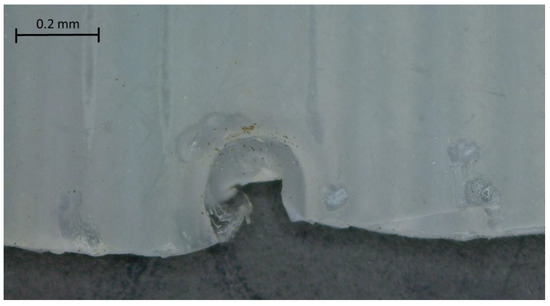 The main cause of failure in polymers is structural damage on a microscopic scale, such as microcracks. These are the result of impacts and internal stresses and are dangerous due to their undetectable nature and also due to the induced fragmentation of the structure, leading to reduced mechanical properties such as strength, stiffness and corrosion. Adding the layered manufacturing process increases these types of defects from the manufacturing process itself. These internal defects not only decrease the performance of the material, but also serve as catalysts for other damage, such as macrocracks, moisture swelling and corrosion. This microcrack, swollen by the action of chlorine, can be seen in Figure 3. The halogenated component of this solvent, chlorine, is by nature a non-metal located in group VII of the periodic table. These substances have a defined partial pressure that increases with the amount of volatilized chlorine gas, which, due to thermodynamic effects (chemical potential), tries to escape to the outside and meet the pores of the polymer, which expands due to the amount of chlorine atoms that try to escape from the surface (Figure 3). In other words, the chlorine tries to dissolve the polymer material by invading its structure and swelling it. This causes a volume increase in the samples. The gas tries to escape through the largest area of the sample, which was also placed horizontally for drying over a long period of time, which is why the thickness was first increased. However, this softening of the material causes the large voids (interfacial and interlayer cavities) to stick together.