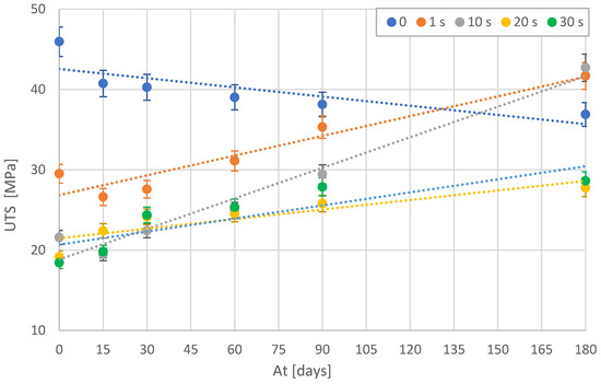 Average ultimate tensile strength (UTS) of treated and untreated samples as a function of ageing time [At].