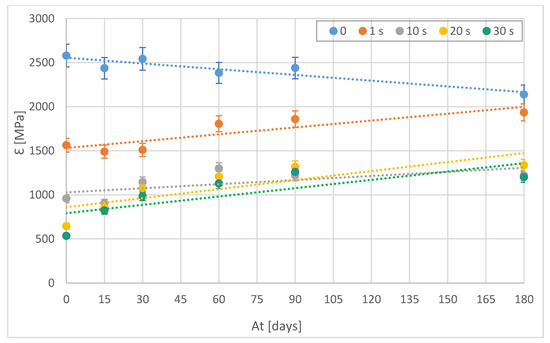 On the other hand, the elastic modulus (ε) behaves similarly to the maximum stress with similar settings (Figure 6). Thus, untreated samples lose stiffness over time. In contrast, the treated samples, which initially become more elastic, approach the values of the untreated samples over time. This indicates a loss of the impact of the treatment on the material over time.