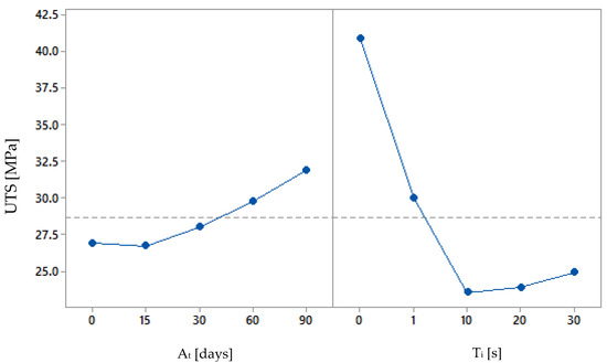 Main effects of ageing effect [At] and immersion time [Ti] on the average ultimate tensile stress [UTS] of the samples.