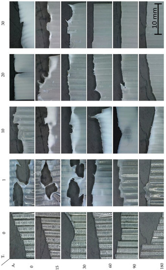 In PLA, a creep zone usually forms at the crack tip. However, shear creep produces a Dugdale-type band creep zone ahead of the crack tip. Of the two creep mechanisms in the untreated PLA, crazing is rather more likely ahead of the crack tip, due to the triaxle stress state. For this reason, these samples show a more brittle and continuous fracture (Figure 9). However, in some cases, each strand broke individually, resulting in a crack discontinuity. The treated samples appear to show the fibril breakage mechanism. For this reason, much more pronounced stress concentrations vaguely appear in different areas, breaking the sample into several zones. This is also one of the main reasons for the much lower stresses supported [26].
