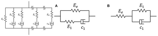 (A) Generalized Maxwell material model (left) with SLS or Zener model represented in Maxwell (center) and (B) Kelvin–Voigt (right) forms (Lin) [16].