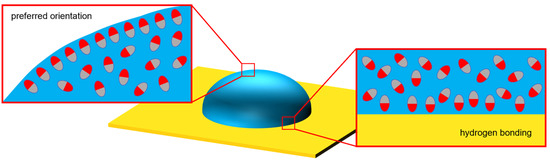 Illustration of interfacial polar molecule behavior and preferred orientation (left) and substrate effects such as hydrogen bonding on polar molecules (right).