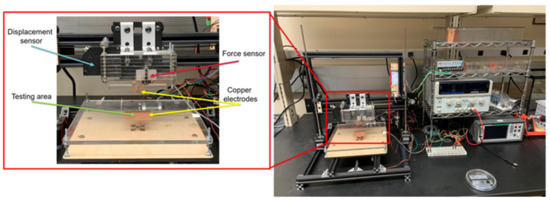 A detailed view of the force application mechanism with associated equipment for mechanoelectrical testing (right) including magnified region of soft polymeric sensing region (left).
