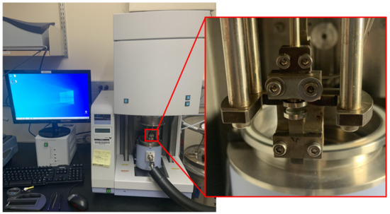 A dynamic mechanical analyzer (Perkin Elmer Pyris Diamond DMA) was also used to construct a stress–strain relationship for each of the gel samples. The effects of the differing types of plasticizers on the material modulus might differ across tested P4 samples. This was performed to isolate the effect of plasticizer type on the material properties of gel samples. Additionally, the weight ratio of these samples may be equal across all tested P4 samples, but the molecular weight of each of these plasticizers differs. This potentially relates to different amounts of free interstitial plasticizer and volumetric differences in plasticizer migration. An image of this setup is given in Figure 5.