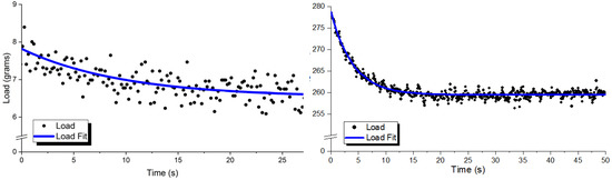 The viscoelastic properties are also modeled using the Maxwell form of the SLS material model. This is due to the exponentially decaying viscoelastic stress relaxation observed in experimentation, as shown in Figure 9. In the upper portion of this figure, the SLS model is fit to viscoelastic stress relaxation in the low-force region. This region typically shows less viscous behavior and has a smaller magnitude of the Maxwell arm relating to the overshoot in stress from a stepped strain input. The lower portion of this figure shows the viscoelastic stress relaxation in the higher force region where more viscous effects are observed, as seen by the larger stress decay.