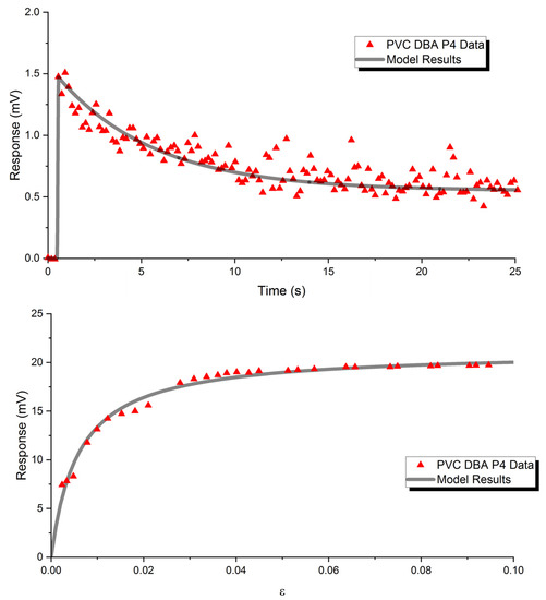 Obtained experimental data and mathematical model results for transient (top) steady-state (bottom) response characteristics showing ability of the model to reflect experimental results of soft polymer gel sensors.