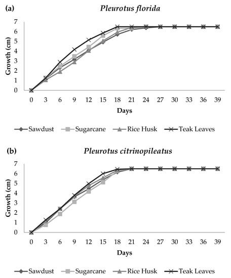 Figure 1a,b demonstrates the growth performance of the white oyster (Pleurotus Florida) and yellow oyster (Pleurotus citrinopileatus) mushrooms in four different lignocellulosic substrates in the form of a linear graph. Growth was interpreted at 3-day intervals during foam formation, and the height of the fungal growth was marked on the cup to observe the pattern of the growing phase of both mushroom species. The average fungal growth in both species was highly dependent on the types of substrates used because different species have different preferred substrates. In addition, the activity of enzymes released by Pleurotus to absorb nutrients and stimulate mycelium growth is also bound to affect fungal growth [2].
