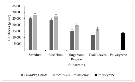 Hardness is a measure of a material’s resistance to the application of a force that results in a change to its shape [25]. The compressive strength test is a common way of evaluating biodegradable packaging, and Holt et al. [26] examined this standard test procedure. It is important to carry out compressive strength studies to identify the firmness of the fungal foam, especially since the quality of the foam is indicated by its ability to withstand impacts. Consequently, samples with greater hardness have better impact resistance, rendering them more appropriate as protective materials. Figure 2 shows the hardness of fungal foam produced from different substrates and polystyrene as the control.