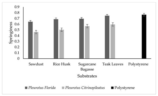 Springiness for different mushroom species of fungal foam in various types of substrates and polystyrene as the control.