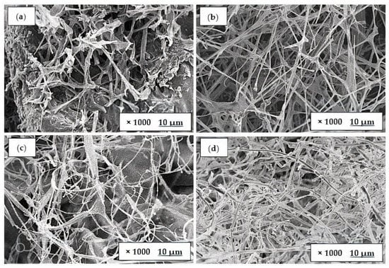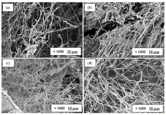 Figure 5 and Figure 6 depict the morphology of fungal foam from white and yellow oyster mushrooms, respectively, grown in different lignocellulosic biomasses as substrates. A mycelial film covered the surface of all materials; however, the texture and porosity of the membrane varied according to the type of substance used [36]. Both Figure 5 and Figure 6 demonstrate that the hyphae of fungal foam in sugarcane bagasse (c) and teak leaves (d) is more compact and has higher mycelium networks compared with the fungal foam in rice husk (a) and sawdust (b). The mechanical property evaluation revealed a contradictory correlation between hardness and compact filaments, indicating that the mycelium filaments present in the fungal foam contributed to this characteristic.