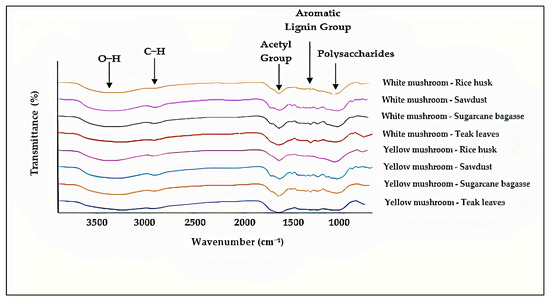 FTIR analysis was performed between the 650 and 4000 cm−1 wave number region. Figure 7 shows the FTIR spectra of the white oyster mushroom and yellow oyster mushroom utilizing rice husk, sugarcane bagasse, teak leaves, and sawdust as substrates. The infrared absorption spectra of the fungal foams are associated with the molecules present in the mycelium and substrate media [34], e.g., polysaccharides (1200–900 cm−1), nucleic acids (1255–1245 cm−1), proteins (amide I at 1700–1600 cm−1, amide II and III at 1575–1300 cm−1), and 234 lipids (3000–2800 cm−1, ~1740 cm−1) [37].