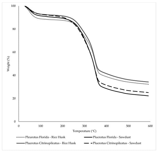 The thermal stability of fungal foams of Pleurotus Florida and Pleurotus citrinopileatus using rice husk and sawdust were evaluated by Thermogravimetric (TGA) with temperatures ranging between 30 °C and 600 °C, as shown in Figure 8. There were three main phases in this test, namely, the drying and evaporation stage, the devolatilization stage, and the decomposition stage [38].
