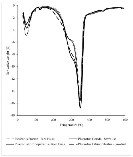 The first phase occurred between 40 °C and 130 °C. In this stage, the white oyster mushroom in rice husk showed the highest percentage of weight loss, which was 11.04%, followed by the white oyster mushroom in sawdust (8.46%). As for the yellow oyster mushroom, both rice husk and sawdust had less than 8% weight loss. The next stage of weight loss occurred at temperatures between 200 °C and 450 °C, where the devolatilization of the biocomposites takes place. There is a specific phase in the breakdown of lignocellulosic materials such as cellulose, hemicellulose, and lignin [34]. However, there were no significant differences between the thermal degradation of hemicellulose and cellulose at that stage. In addition, all samples showed a similar trend to the thermal temperature degradation of cellulose because the cellulose composition of substrates does not differ significantly among the substrates (50% in rice husk [39], 36% in sugarcane bagasse [22], 36.9% in teak leaves [40], and 41.58% in sawdust [16]). The third phase involved the decomposition of lignin at temperatures over 500 °C. At this stage, the degradation of the primary residual char resulted in the production of carbonaceous char residue until the burning sample was stopped at 600 °C [41].