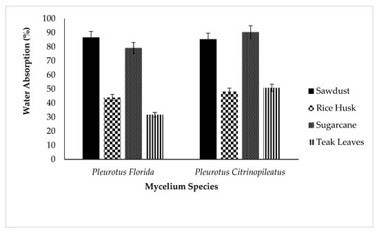 Water absorption of fungal foam from Pleurotus florida and Pleurotus citrinopileatus in different substrates.
