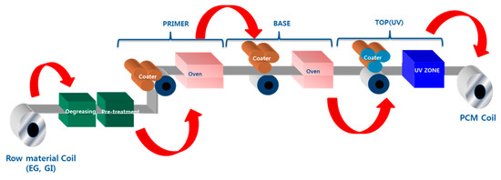 Pre-Coated Metal (PCM) coatings are applied to a uniform panel prior to pre-coating and metal processing, making it substantially more productive than coating complicated shapes of metals. The coated steel panels are milled into various products by cutting, forming, and assembling. It is a product fabricated in the way paints with corrosion resistance and formability are coated on electro-galvanized steel or galvanized steel sheet with 0.3~2.0 mm of thickness. PCM coatings are primarily applied to improve the appearance of refrigerators, washing machines, microwave ovens, and air conditioners. It has broad applications as it does not need additional post-processing, such as coating after processing [1,2,3,4,5].
