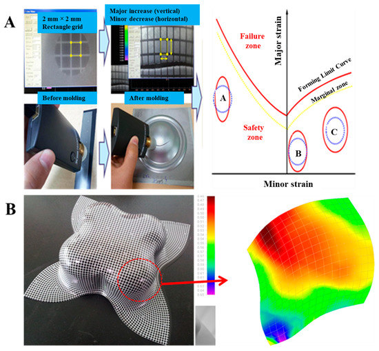 Failure and safety zone in FLD and ASAME strain analysis: (A) Failure and safety zone in FLD and (B) cross-die test sample ASAME target model strain analysis.