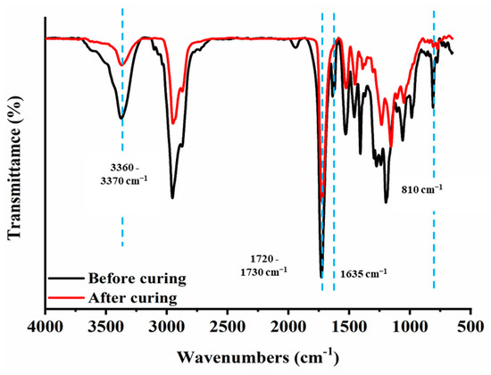 FTIR analysis was conducted to evaluate a change in IR attribute peak before and after curing. Figure 4 depicted the spectra of P-IBOA coating formulation before and after UV-curing. Before the curing of P-IBOA formulation, there was a strong absorbance of acrylate group C=C at 810 cm−1 and 1635 cm−1. After curing, the acrylate group (C=C) peaks at 1635 and 810 cm−1 disappeared in the spectrum cured PUA film owing to the crosslinking reaction accompanied by photopolymerization. Moreover, the attribute peaks at 3360–3370 cm−1 (N-H stretching) and 1720–1730 cm−1 (carbonyl stretching) were observed after photopolymerization. It indicates that the urethane acrylate oligomer was polymerized successfully into polyurethane acrylate films. Similarly, after curing, the acrylate group (C=C) peaks at 1630 and 810 cm−1 disappeared in the spectrum cured P-IBOMA, P-HDDA, and P-TPGDA films owing to the crosslinking reaction accompanied by photopolymerization. There are no significant changes in the characteristic peaks.