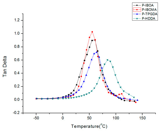 Dynamic mechanical analysis (DMA) is a suitable and effective technique to study the viscoelastic properties of UV-cured polymeric materials. The DMA data concede observations of changes in loss and storage modulus, glass transition temperature (Tg), and cross-link density of paints and coatings. Figure 6 represents the tan δ of the UV-cured films as a function of temperature. The tan δ values of mono-functionality reactive diluents, P-IBOA and P-IBOMA, have relatively higher than those of P-TPGDA and P-HDDA, which are multi-functionality reactive diluents. The Tg of P-IBOA and P-IBOMA is less than both P-TPGDA and P-HDDA, which provides low stiffness and high softness to the polymer coatings. The Tg of UV-cured coatings was increased as the functional groups increased. Mono-functional reactive diluents lead to a decrease in Tg, modulus, and ductility, while multifunctional reactive diluents lead to an increase in Tg, modulus, and ductility because a high degree of functionality of reactive diluents leads to a high reaction rate and a high degree of crosslinking density [22]. P-TPGDA and P-HDDA-based coatings have extra reactive sites in the backbone for crosslinking as compared to monofunctional reactive diluent-based coatings. The multifunctionality also can lead to a low final degree of conversion because early gelation of the UV-irradiated sample restricts the mobility of the reactive sites and can lead to the glassy nature of the polymer coatings, resulting in the increase in Tg of the UV-cured coatings [23].