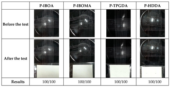 As in Figure 10A, P-IBOMA was a little swollen in the alkali resistance test, and the other films showed no particular sign. These results indicate that a low cross-linking density makes solvent molecules easy to penetrate in film networks, swelling the film in the organic medium. All films showed good results against the acid resistance test. As shown in Figure 10B, P-HDDA turned out to have the most superb performance compared to other UV-cured coating films.