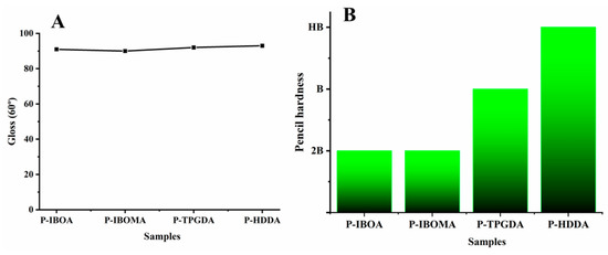 Gloss is one of the substantial properties for coating applications, as determined by the micro-tri-glossometer. Figure 8A shows the effect of the reactive diluents on the gloss values of the surface of the cured bonds, whereas the hardness of P-IBOMA turned out to be a low grade of 2B, so it is hard to be applied to the actual PCM applications because of the very low-hardness films. All of the UV-cured PUA coatings with different reactive diluents depicted similar gloss values at the angle of 60°. As shown in Figure 8B, P-HDDA showed the maximum hardness due to the high crosslinking density.