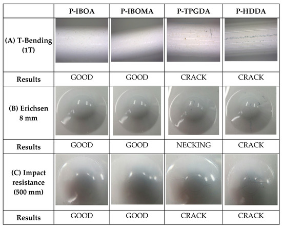 (A) 1T T-bending, (B) Erichsen (8 mm), and (C) impact resistance (500 mm) test images of UV-cured PUA coating films.