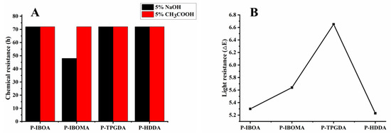 (A) Chemical resistance and (B) UV-light resistance of UV-cured PUA coating films.
