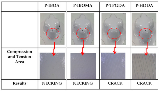 The effect of failure and safety zone on the materials used in press forming was analyzed by the Limit Punch Height (LPH) and Forming Limit Diagram (FLD) of the fabricated films according to the varied reactive diluents. The drawing strain of the film was also analyzed via ASAME, while LPH, which is intended to measure the maximum height at which forming material is possible before it is fractured, represents quantitative features according to the compression and tension. As shown in Figure 2, measurements were made using a cross-die drawing mold. The cross-die drawing sample was produced using a deep drawing machine (USTM, 150T-WF500). The experimental conditions were 10 t of blank holding force and 20 mm/min punch speed. As shown in Figure 3A, FLD is shown using a cross-die drawing mold. FLD is an important tool for determining whether a material can be formed or not. It provides criteria for failure and Safety Zone in press forming. FLD analysis can predict the forming limit of PCM. The vertical axis represents the major strain, and the horizontal axis represents the minor strain. A is the uniaxial tensile-compression deformation mode region, B is the plane-deformation mode region, and C is the biaxial tensile-deformation mode region. The formability of a product can be evaluated by plotting on FLD the strain of each part of the test specimen formed by die with lattice marked on it. ASAME, employed to find out with ease of cracks arising during the process, enables us to measure easily the strain distribution of formed material in press forming on cross-section or three-dimension regardless of place. It is possible to identify the strain distribution by using a range of colors via three-dimensional shape information. Purple indicates a low reduction rate of the coating thickness, and red suggests a high reduction rate [17,18,19].