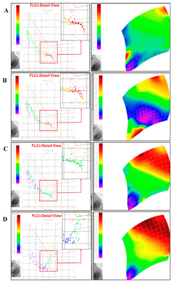 ASAME strain signature for UV-cured PUA coating films: Result of the sample (A) P-IBOA, (B) P-IBOMA, (C) P-TPGDA, and (D) Result of sample P-HDDA for draw depth 40 mm.