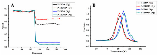 (A) Curing behavior and (B) Tan δ values of UV-curable PUA coating films in the O2 and in N2 atmosphere.