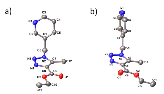 - Brito, I.; Kesternich, V.; Pérez-Fehrmann, M.; Araneda, C.; Cárdenas, A. Crystal Structure of Ethyl 5-Methyl-1-(Pyridin-3-Yl)-1H-1,2,3-Triazole-4-Carboxylate, C11H12N4O2. Z. Für Krist. -New Cryst. Struct. 2017, 232, 1011–1012. [Google Scholar] [CrossRef]
