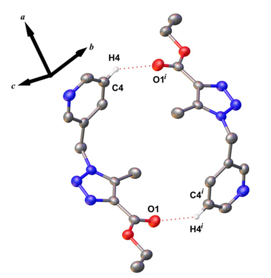 Figure 2 shows intermolecular C(4)–H(4)···O(1)i hydrogen bond interactions that give rise to centrosymmetric dimers with a graph-set notation [50] along the crystal structure of P1.