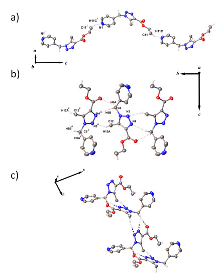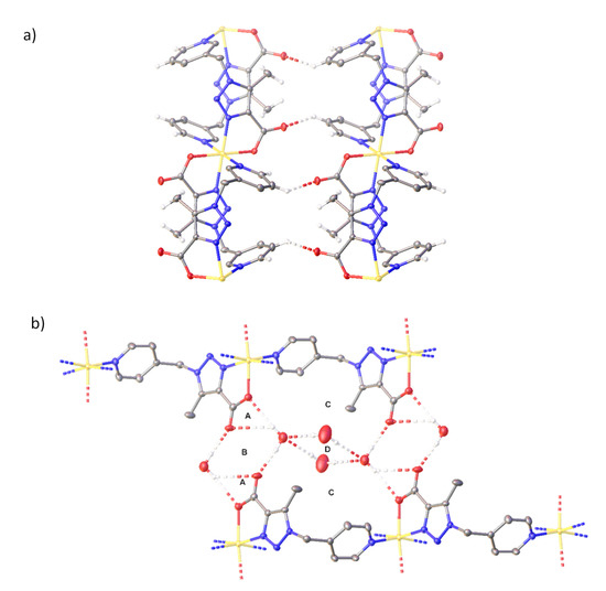 Coordination polymers (CPs) are a family of compounds formed by the integration of metal entities and organic ligands that have been widely studied in recent decades due to their interesting structural features, and their chemical and physical properties [1,2,3,4,5,6], such as gas adsorbents [7,8,9,10], ion exchange [11,12], luminescence [13,14,15], magnetic materials [16,17], or catalysis [18], among others, have been described. Their structural design and/or physicochemical properties largely depend on the selection and combination of the building blocks, i.e., the organic ligands (spacers) and metal ions (nodes) [19]. Considering that our compounds are two-dimensional, we will refer to them as coordination polymers. The properties of CPs are not only affected by their intrinsic structural coordination bonds, but also by supramolecular interactions that can be formed between different structural moieties. Therefore, the generation of CPs based on the use of new organic ligands with specific structural and/or physical features opens new alternatives for material designs with desired properties [20,21,22,23,24,25,26]. On the other hand, solid-state properties for these crystalline materials, such as thermal stability, and fluorescent emission, can be related to the structural conformation and the coordination modes of the metal center used to synthesize these compounds.