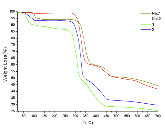 The thermogravimetric analyses of NaL1, NaL2, 1, and 2 were recorded with a heating rate of β = 10 °C·min−1 under a dynamic nitrogen atmosphere at 20–700 °C. All curves are shifted to a higher temperature at a constant heating rate.