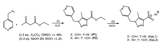 The syntheses of the precursors, P1 and P2, were carried out according to the literature [42,43,44] using [3 + 2] dipolar cyclo addition between n-methylpyridyl azide (n = 3 or 4) and 1,3-dicarbonyl compounds, such as ethyl acetoacetate (Scheme 1). In general, the ester precursor yields are moderate (35–70%); meanwhile, the sodium carboxylate salts, NaL1 and NaL2, gave quantitative yields. The resulting compounds are hygroscopic and thus must be stored in a dry box or inert gas atmosphere. These compounds are very soluble in water and soluble in other protic solvents, such as ethanol or hot methanol.