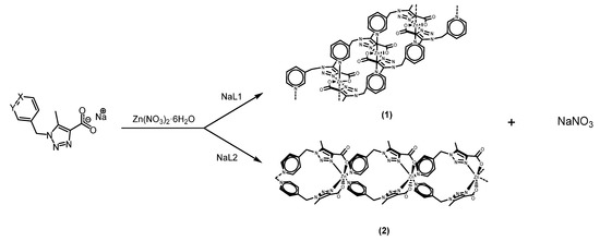 This work focuses on the controlled design of Zn(II) CPs by designing flexible organic ligands that act as building blocks favoring interesting topologies [27]. The fine selection of positionally isomeric organic ligands, and their role in the structure of the CP, is a relevant aspect to study since it can also affect their physical properties. For instance, the isomeric effect [28,29,30] over coordination metal complexes can generate the difference between molecular or extended solids [25,30,31] and can affect the luminescent and thermal properties. Specifically, the luminescent properties could be modified on demand by appropriately selecting these building blocks. Additionally, great attention is focused on the study of luminescent Zn(II) complexes in the solid state and in solutions. Luminescent Zn(II) complexes are used for the production of organic light-emitting diodes (OLED) [32,33,34,35,36,37]. Our previous studies show how the isomeric position of ethyl 5-methyl-1-(pyridin-3-yl)-1H-1,2,3-triazole-3-carboxylate/-4-carboxylate type organic ligands has allowed for the obtaining of monodimensional Cd(II) CPs to supramolecular 3D networks with the consequent modification of their emission [28,38,39,40,41]. We have now selected Zn(II) as the d10 metal center and, as the flexible organic ligand, the tecton, 5-methyl-1-(pyridine-3-ylmethyl)-1H-1,2,3-triazole -4-carboxylate (NaL1), and 5-methyl-1-(pyridin-4-ylmethyl)-1H-1,2,3-triazole -4-carboxylate (NaL2) two positional isomers. These two ligands have a non-rigid methyl spacer group (–CH2–), which plays an important role in the construction of the Zn(II) CPs, with an influence on its luminescent properties. Additionally, it is worth mentioning that the preparation of materials based on Zn(II) brings additional advantages based on non-toxic features and natural availability. The study includes the synthesis, structural characterization, and photophysical properties of the novel CPs and their comparison with the previous related ones based on Cd(II).