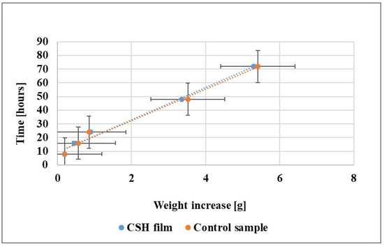 Ma was determined according to the method described in ASTM D 570-98 [40]. Triplicate specimens of CSH film samples were cut into pieces 3 × 3 cm, dried at 105 °C, and initially weighed before being placed in the climate chambers. The weight of the samples was measured at different time intervals.